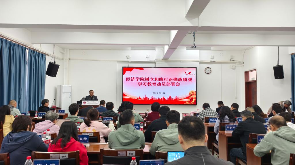 3月4日下午,经济学院在博文楼C座508报告厅召开树立和践行正确政绩观学习教育动员部署会,学院党政领导及全体教职工参加会议,会议由学院院长陈伟主持,学院党委书记刘金明作动员部署。