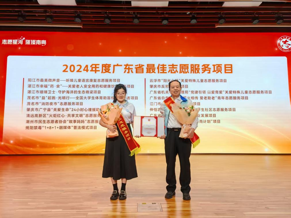 2025年10月23日下午,以“志愿星河 璀璨南粤”为主题的首届广东志愿服务先进典型嘉许礼暨现场展示交流活动在广州图书馆隆重举行。广东海洋大学“珊瑚卫士:守护海洋的生态脊梁”项目,从众多参评项目中脱颖而出,荣获首届广东志愿服务先进典型“四个100”之“最佳志愿服务项目”,经济学院闫玉科教授、经金1221班余达畅代表项目团队受邀出席典礼。