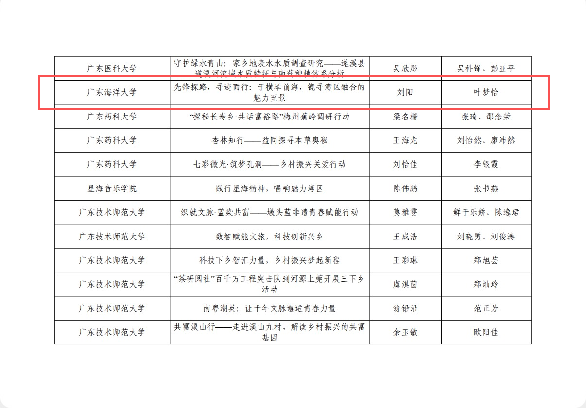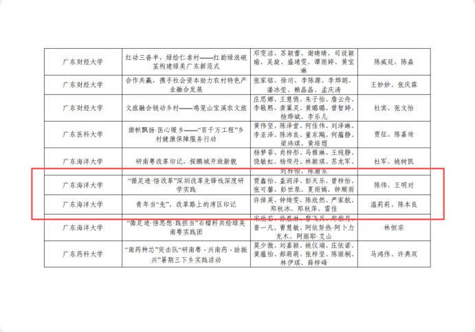 在本次评选中,陈伟院长牵头指导的“循足迹·悟改革”深圳改革先锋线深度研学实践团队,及陈本良副教授、温莉莉老师指导的“青年当‘先’,改革路上的湾区印记”实践团队获评省级优秀实践团队;叶梦怡老师指导的“先锋探路,寻迹而行:于横琴前海,镜寻湾区融合的魅力至景”项目,获评优秀实践项目。