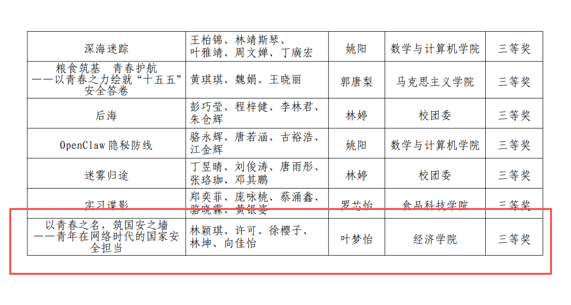 两件获奖作品紧扣总体国家安全观,以青年视角生动诠释了新时代大学生维护国家安全的责任担当。《以吾辈青春 护国安万里》展现了师生党员以青春力量守护国家安全的坚定信念;《以青春之名,筑国安之墙》则表达了青年学子筑牢国家安全防线的真挚情怀。