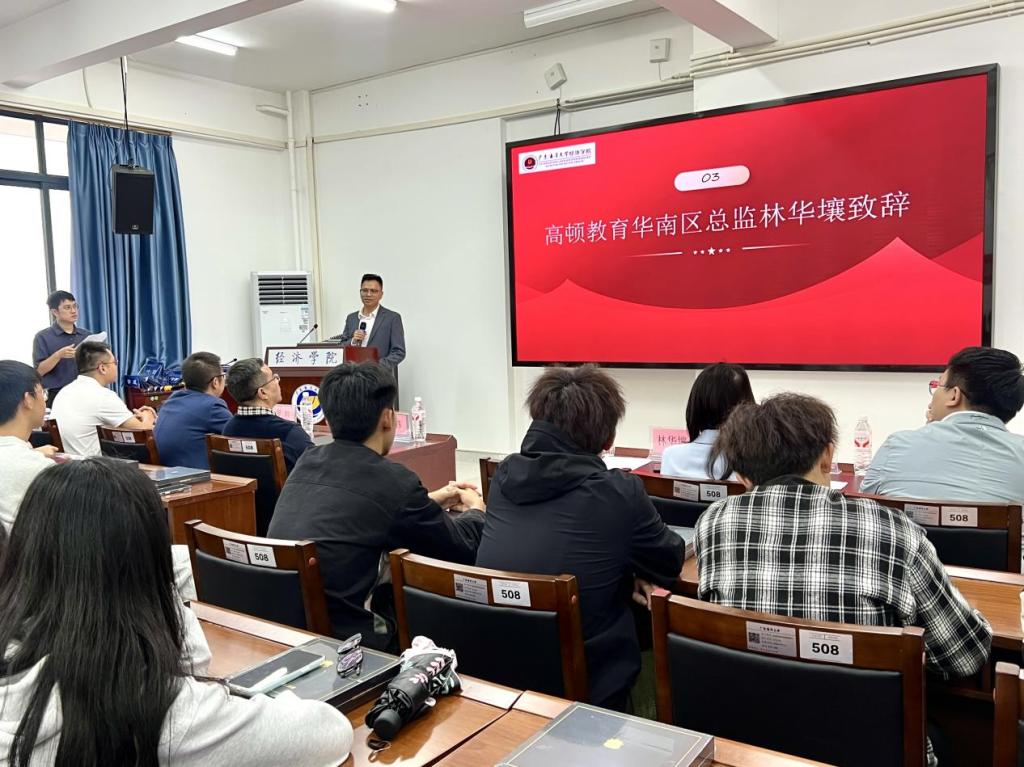 随后,合作企业代表高顿教育集团华南区区域总监林华壤先生从行业视角出发,为同学们描绘了职业发展的广阔蓝图。他对海大经济学院致力于培养前沿金融人才的远见表示钦佩。林总指出,CFA资格认证在全球投资业界享有“黄金标准”的美誉,持有CFA证书的专业人才在高端就业市场中具有显著竞争优势。“我们正处在一个大资管时代,对专业化、国际化金融分析师的需求前所未有,” 他表示,高顿教育集团将全力投入优质教学资源与职业发展服务,“我们的使命是与学院同心协力,不仅帮助同学们顺利通过各级考试,更重要的是搭建起通往知名金融机构的实习与就业快车道,让大家赢在职业生涯的起点。”